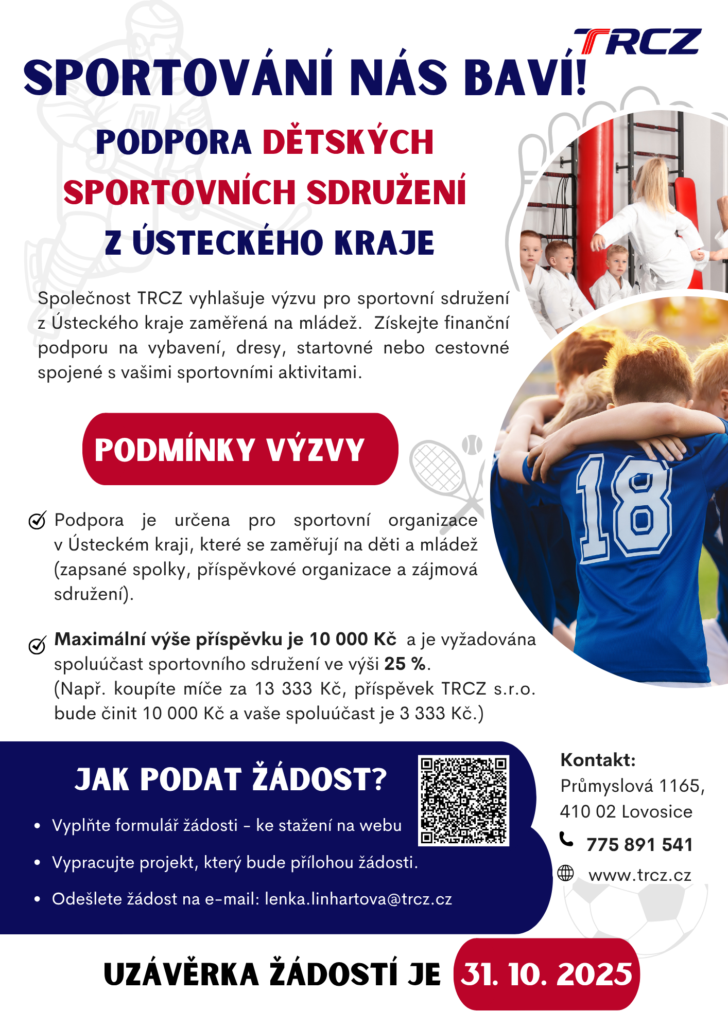 Společnost TRCZ vyhlašuje výzvu pro sportovní sdružení z Ústeckého kraje zaměřená na mládež. Získejte finanční podporu na vybavení, dresy, startovné, cestovné a další provozní náklady spojené s vašimi sportovními aktivitami.