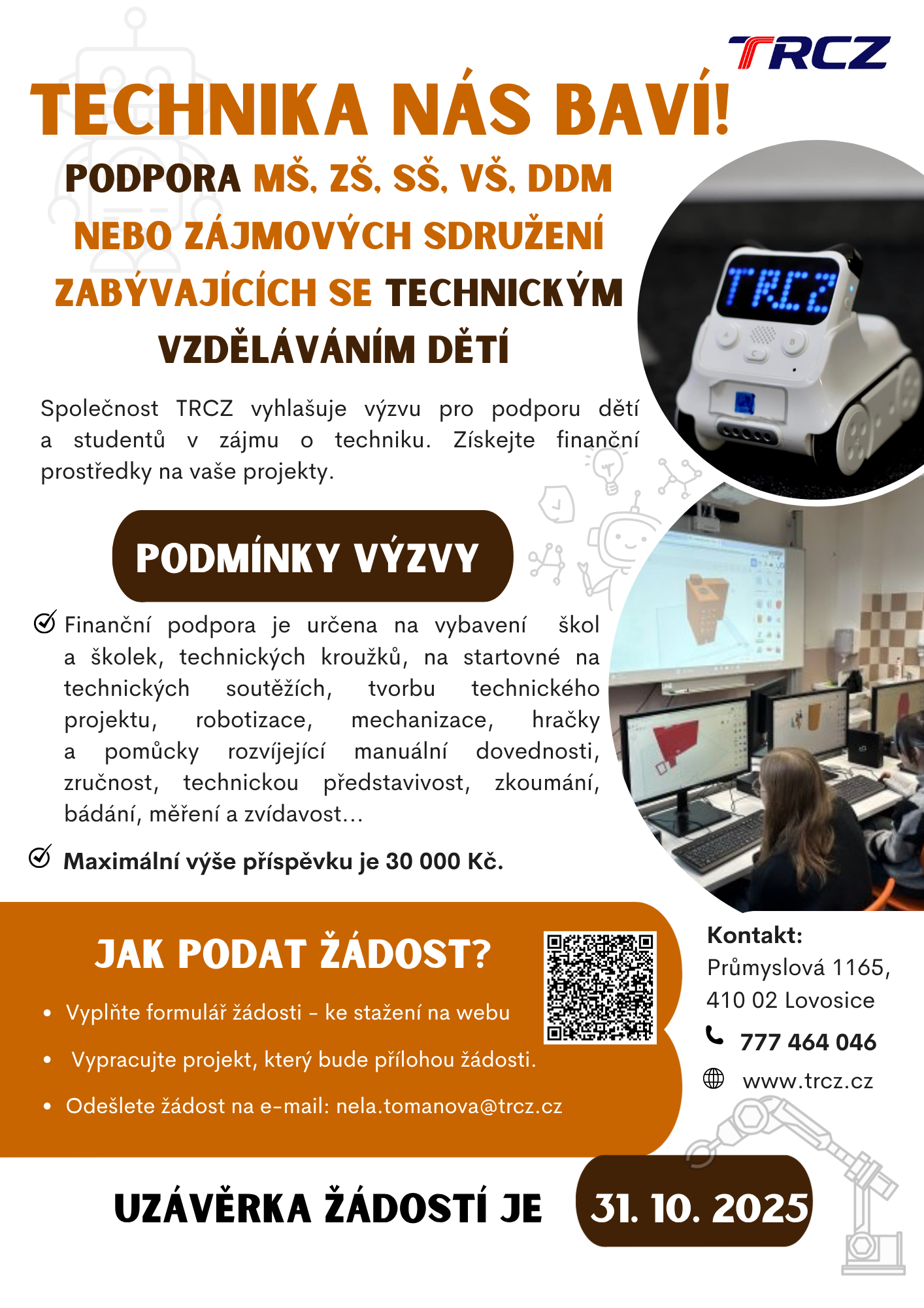 Společnost TRCZ vyhlašuje výzvu na podporu dětí a studentů se zájmem o techniku. Zúčastnit se mohou mateřské, základní, střední a vysoké školy, stejně jako domy dětí a mládeže z Ústeckého kraje.
